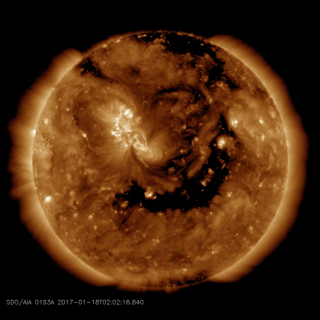 The solar wind is flowing from a large hole in the sun's atmosphere. It's a broad stream that should influence our planet for the next two to three days. Arctic sky watchers can expect continued episodes of bright auroras in the nights ahead. Free: Aurora Alerts