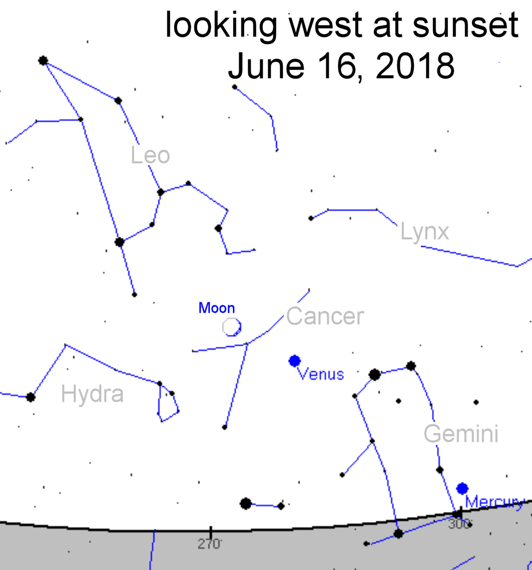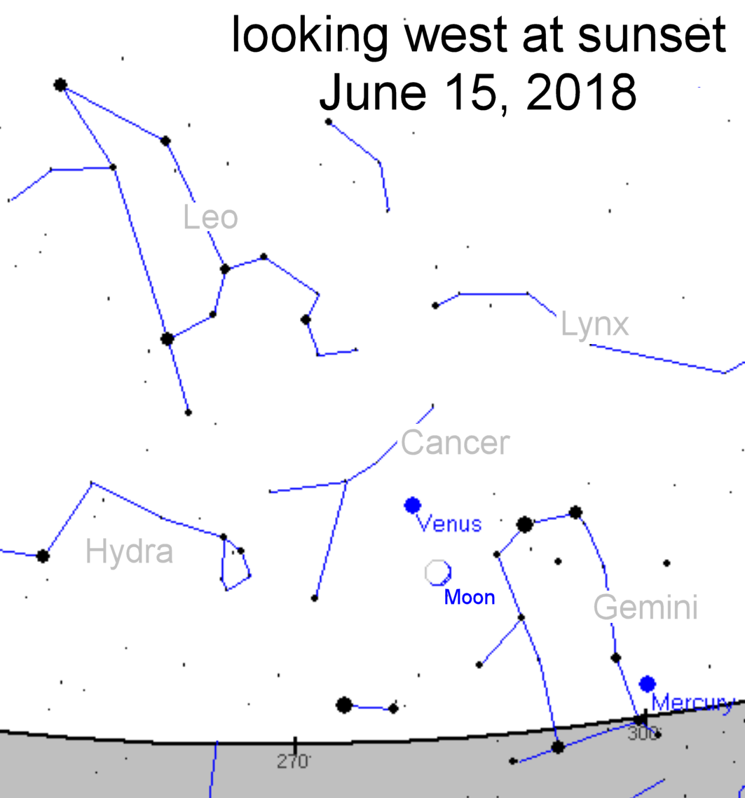 VENUS AND THE MOON: When the sun goes down tonight, step outside and look west. A slender crescent Moon is approaching Venus in the sunset sky. Catch them, if you can, before the sky fades to black. A Venus-Moon conjunction framed by twilight blue is extra beautiful. Sky maps: June 15, 16.