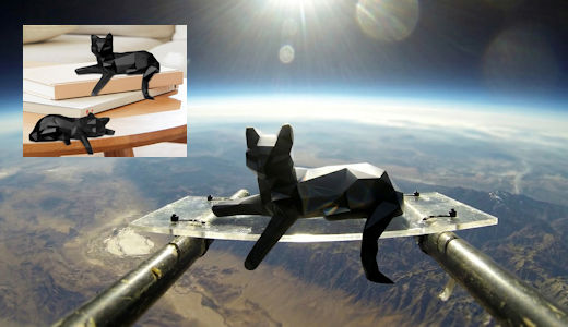 You can have it for $121.95. Hand-carved from resin, this desktop sculpture loves to hang out on bookcases or computer monitors. It comes with a keepsake card showing the cat at the top of Earth’s atmosphere, and telling the story of its flight to the edge of space onboard a cosmic ray research balloon.