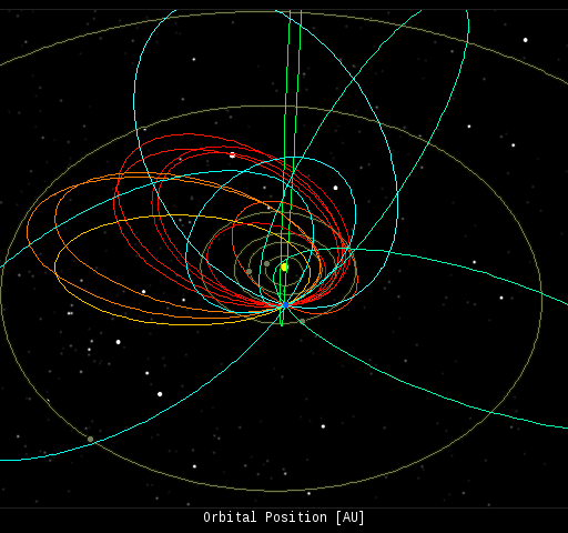 In this diagram of the inner solar system, all of the fireball orbits intersect at a single point--Earth. The orbits are color-coded by velocity, from slow (red) to fast (blue).