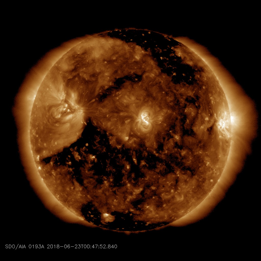 MINOR STORMS ARE UNDERWAY: Arriving a day earlier than expected, a high-speed stream of solar wind is buffeting Earth's magnetic field on Feb 23rd. Minor G1-class geomagnetic storms are underway with auroras around the Arctic Circle. Aurora alerts: SMS Text