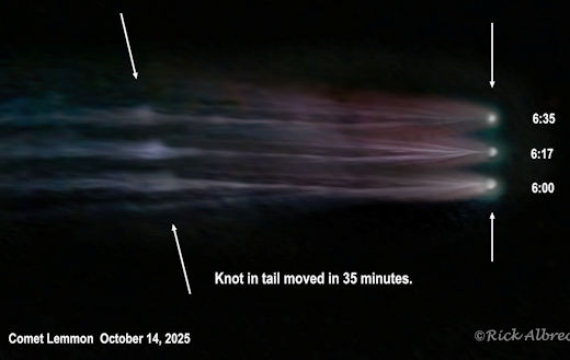 THE CRAZY DYNAMIC TAIL OF COMET LEMMON: One thing astronomers have consistently noted about Comet Lemmon (C/2025 A6) is the unusually high level of activity in its tail. Chunks, knots and whirls of gas are almost-constantly tumbling or rippling away from the nucleus. Here's an example captured on Oct. 14th by Rick Albrecht of Cumming, Georgia: