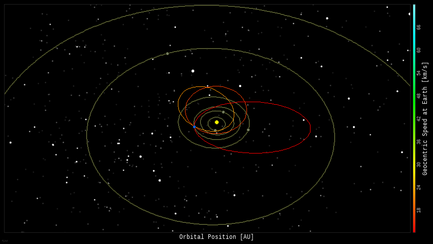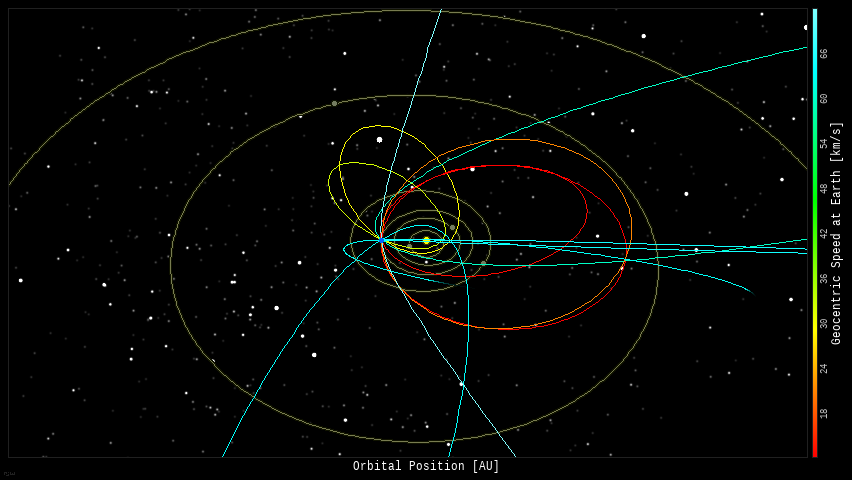 In this diagram of the inner solar system, all of the fireball orbits intersect at a single point--Earth. The orbits are color-coded by velocity, from slow (red) to fast (blue).
