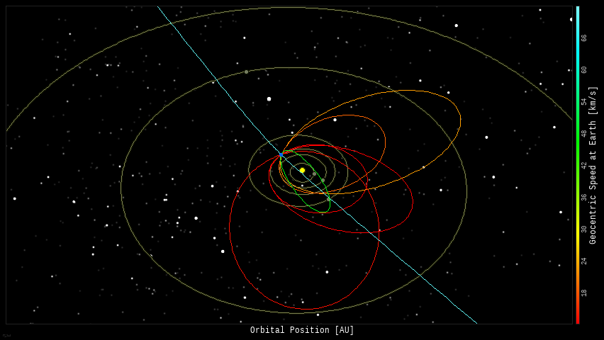 In this diagram of the inner solar system, all of the fireball orbits intersect at a single point--Earth. The orbits are color-coded by velocity, from slow (red) to fast (blue).