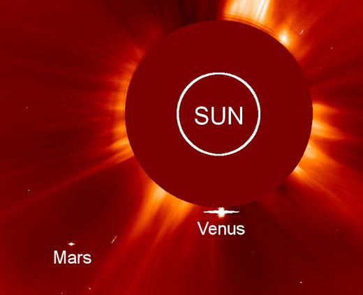 SUPERIOR CONJUNCTION OF VENUS AND MARS: You may not be able to see them, but Venus and Mars are easy to find. Just point toward the sun. Today, the two planets are clustered within a degree of the solar disk, shown here in a SOHO coronagraph image from the early hours of Jan. 6th: