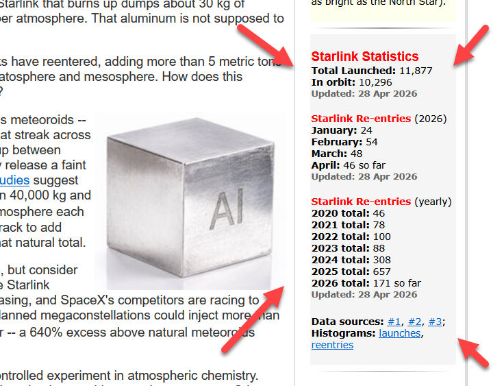 current counts of failed and deployed Starlink satellites from Jonathan's Space Page. See also, all satellite statistics. |