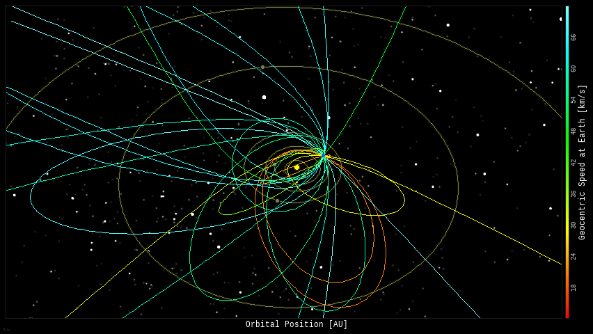 In this diagram of the inner solar system, all of the fireball orbits intersect at a single point--Earth. The orbits are color-coded by velocity, from slow (red) to fast (blue).