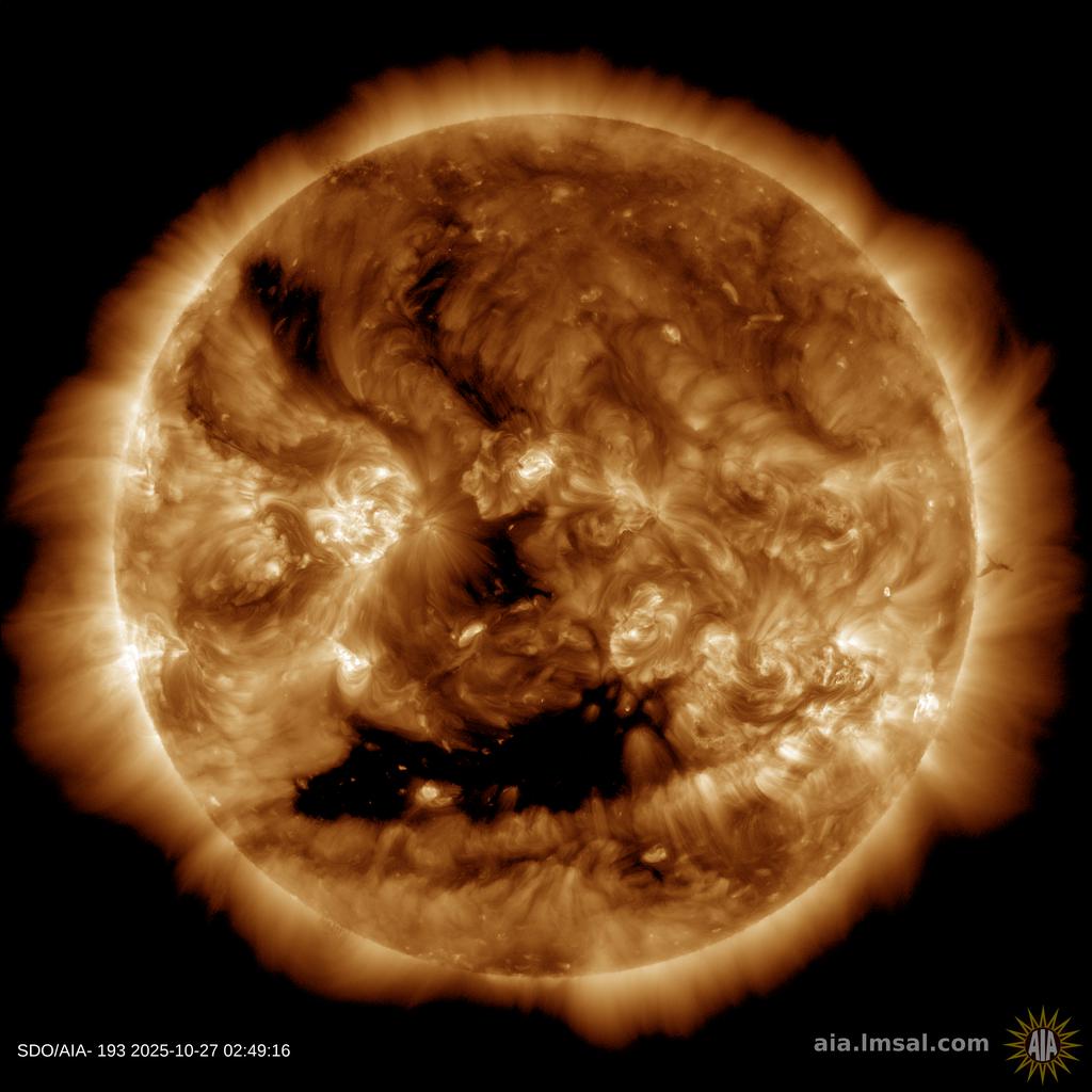 GEOMAGNETIC STORMS POSSIBLE THIS WEEK: A minor CME is heading for Earth, followed close behind by a high-speed stream of solar wind. Their combined impact could cause G1/G2-class geomagnetc storms on Oct. 28/29. High-latitude sky watchers should be alert for auroras. Aurora alerts: SMS Text.