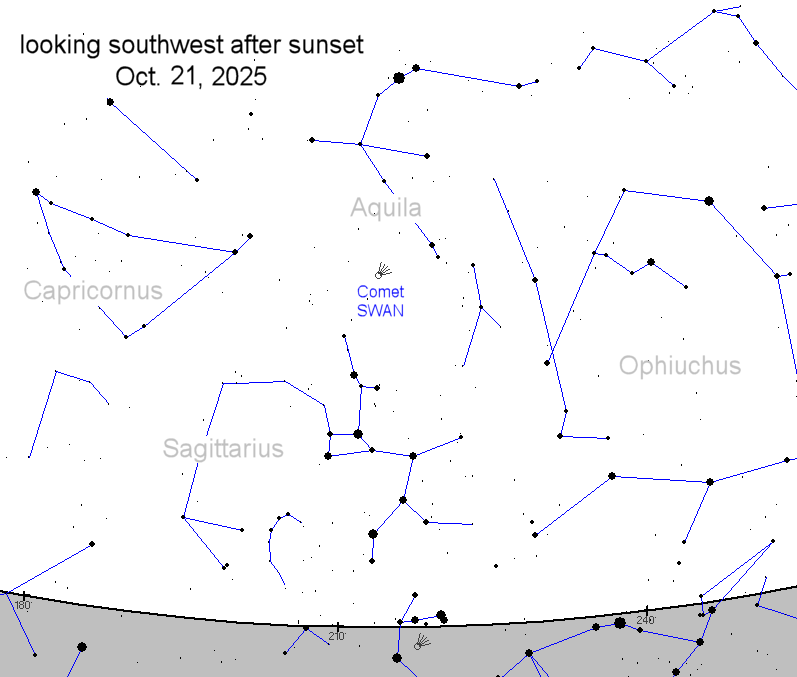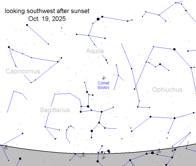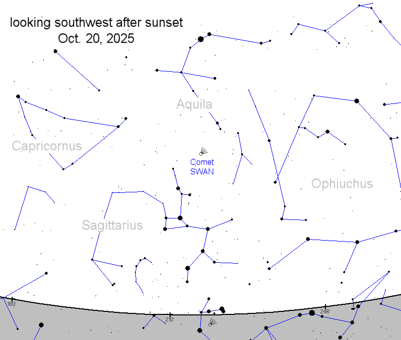 Coincidentally, Comet SWAN is making a close approach to Earth on Oct. 20th, only one day before Comet Lemmon does the same thing. This gives photographers a double photo-op this week. Look for Comet SWAN near the constellation Sagittarius after sunset. Sky maps: Oct. 19, 20, 21.