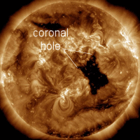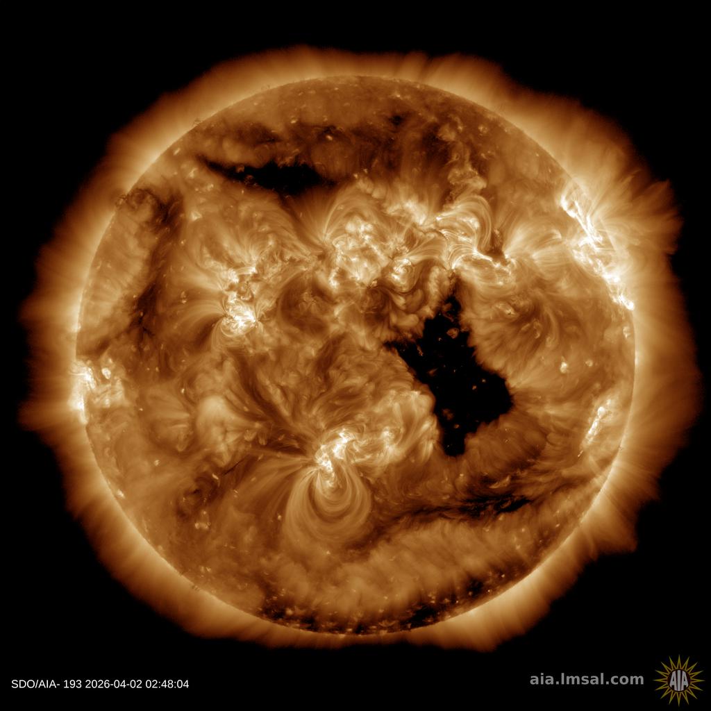 Solar wind flowing from this central coronal hole should reach Earth on April 4th.