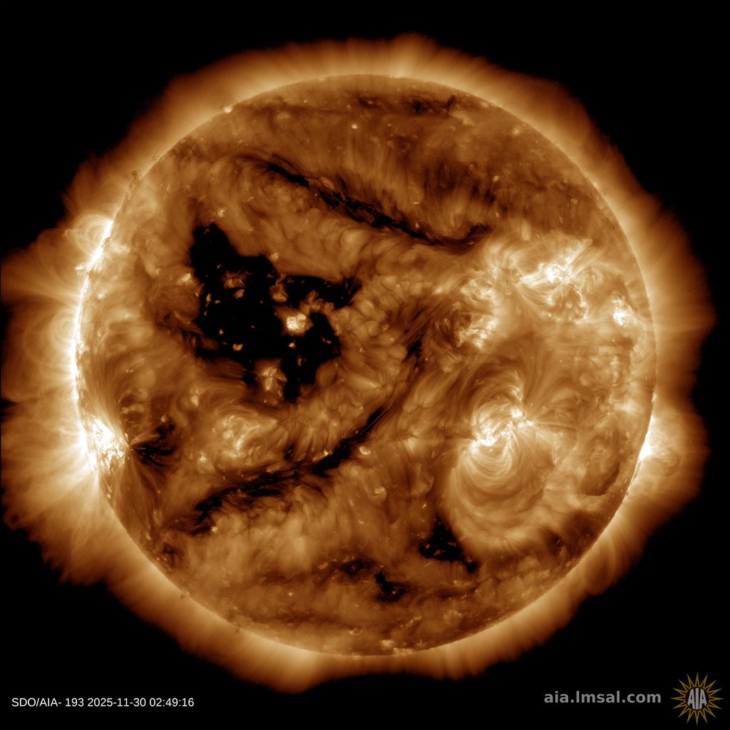 Solar wind flowing from this new coronal hole should reach Earth on Dec. 3-4.