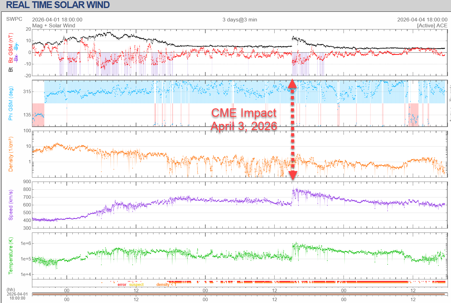 THE STORM IS OVER: A geomagnetic storm that began with a CME impact on April 3rd is over. At its peak, the storm registered G3 (Strong) on NOAA storm scales with bright auroras around the Arctic Circle. Earth's magnetic field is now returning to a quiet state and the polar glow is subsiding. Aurora alerts: SMS Text