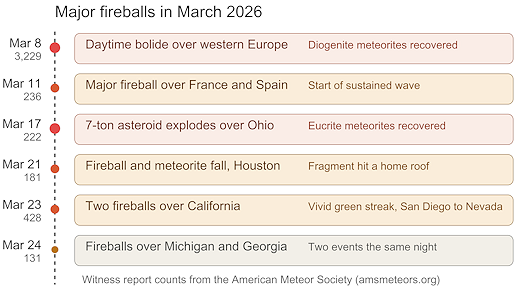 THE DEEPENING MYSTERY OF THE MARCH FIREBALLS: If you love a good mystery, look no further than the night sky in March 2026. There were no major meteor showers scheduled for March, yet suddenly fireballs started appearing everywhere.