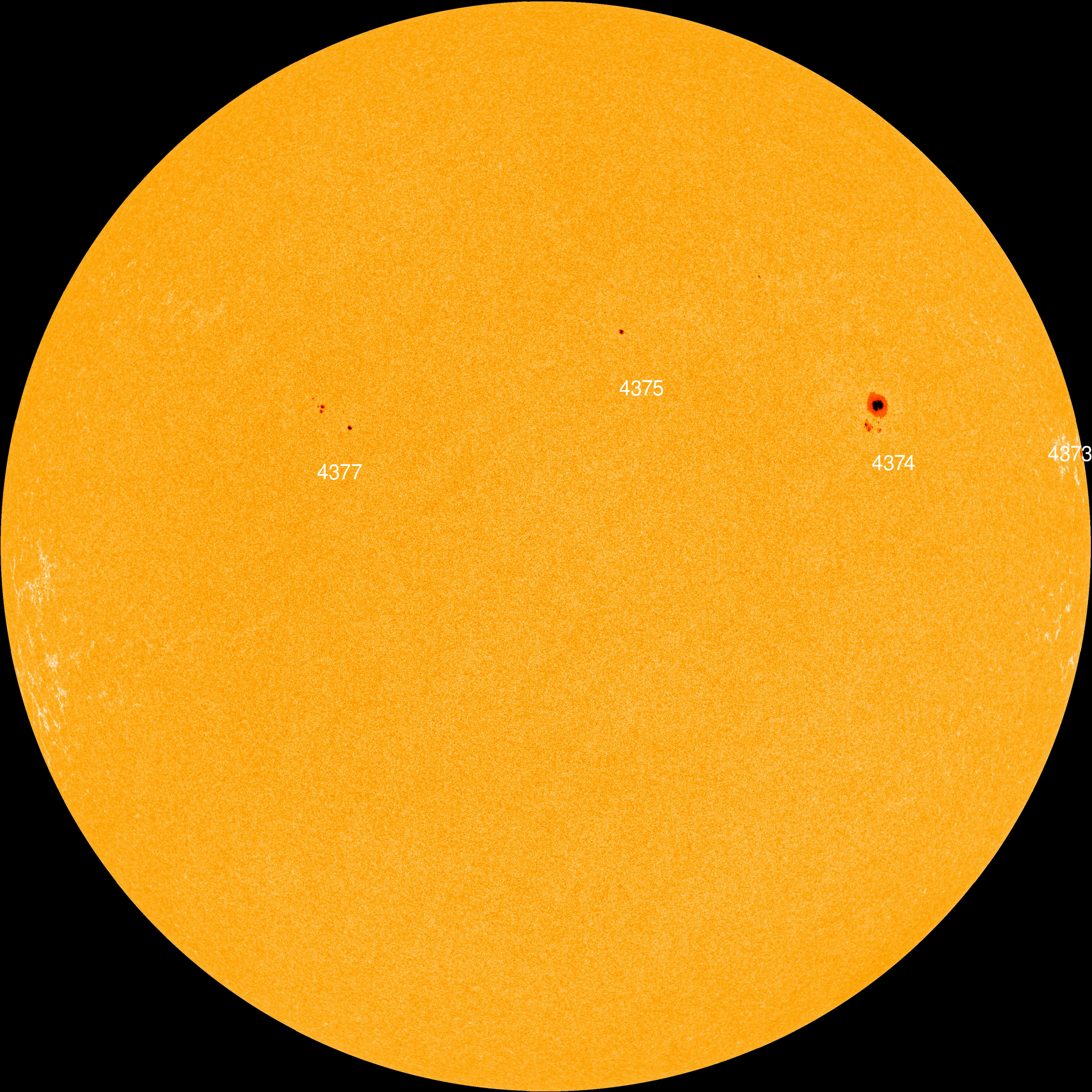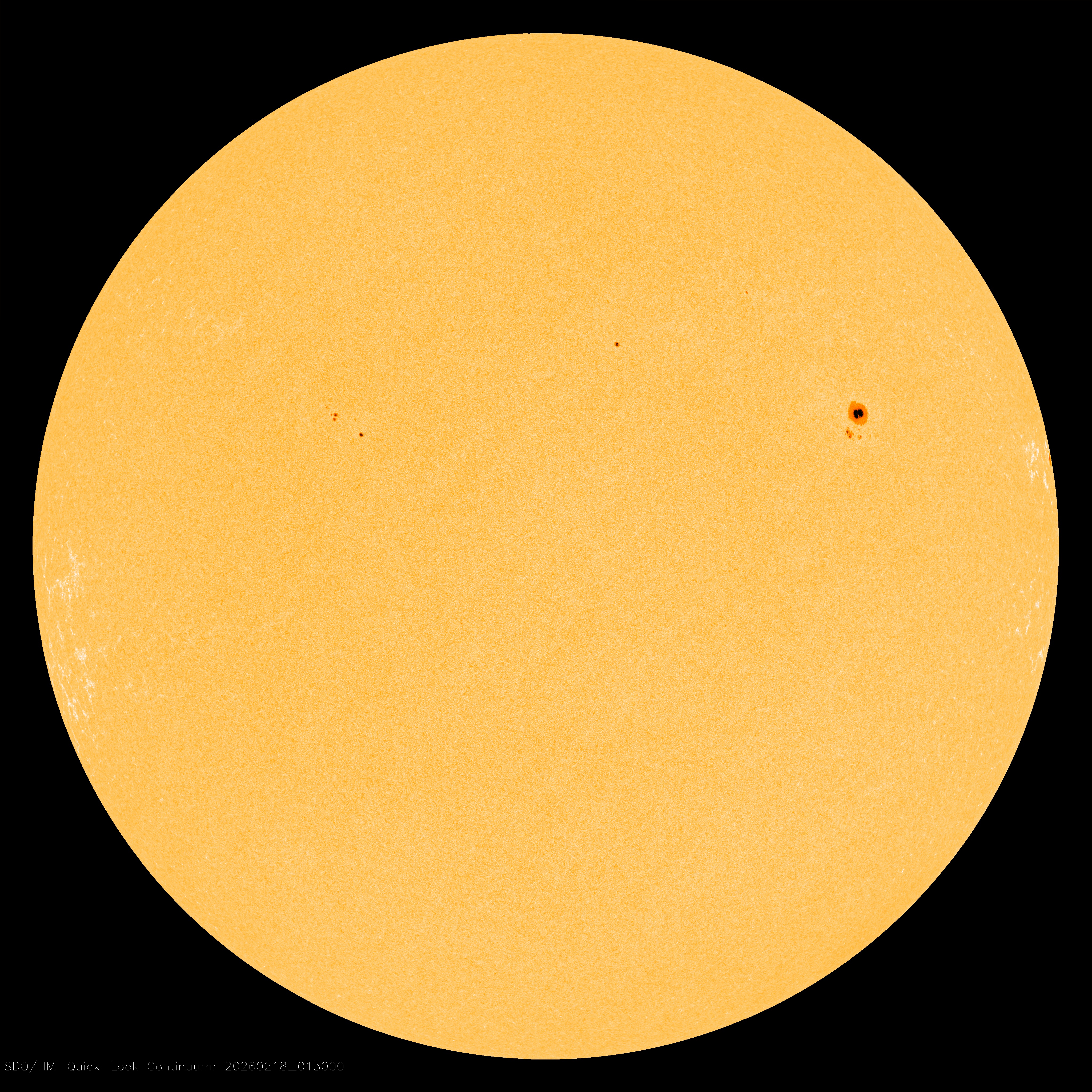 Strong solar flares are unlikely today. All of these sunspots have simple, stable magnetic fields. Credit: NASA/SDO