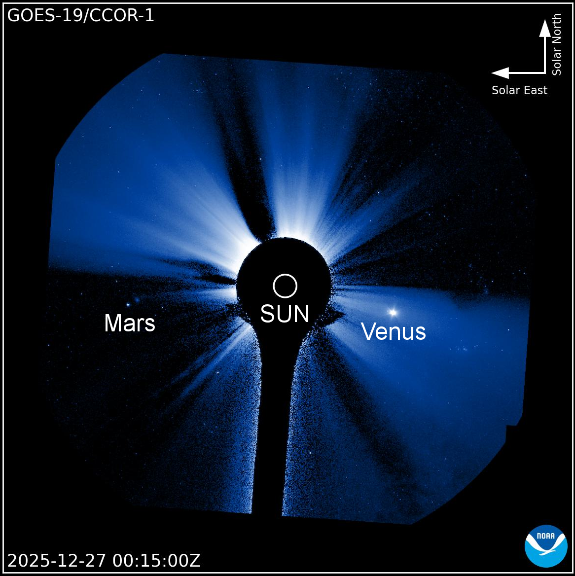 RARE DOUBLE SOLAR CONJUNCTION: Are you looking for Mars or Venus? Don't! You'll hurt your eyes. The two planets are very close to the sun, converging for a rare double solar conjunction. This coronagraph image from NOA's GOES-19 satellite shows the two worlds on Dec. 27th: