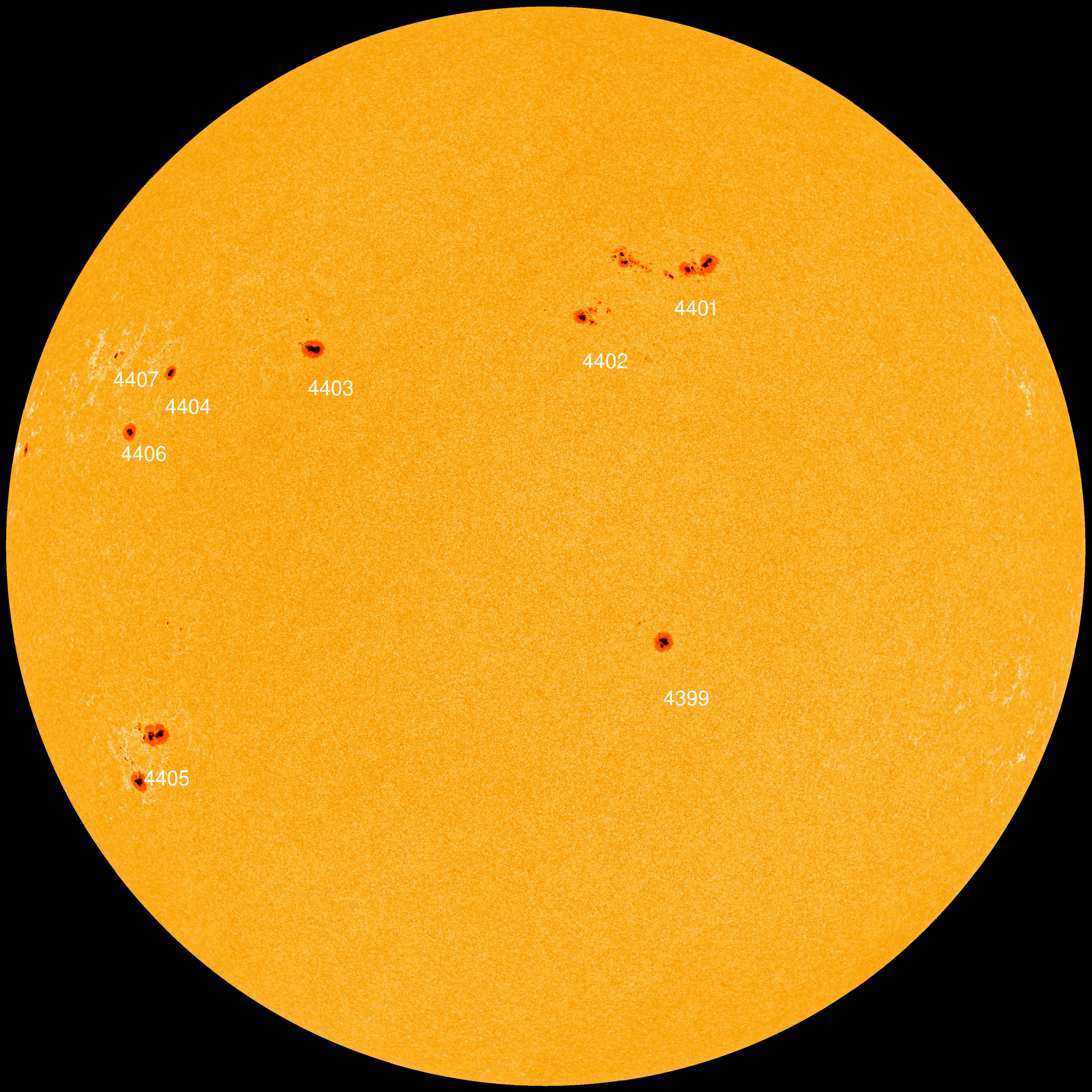 Sunspots 4401 and 4405 both have 'beta-gamma' magnetic fields that harbor energy for M-class solar flares. Credit: NASA/SDO
