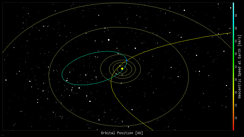 In this diagram of the inner solar system, all of the fireball orbits intersect at a single point--Earth. The orbits are color-coded by velocity, from slow (red) to fast (blue).