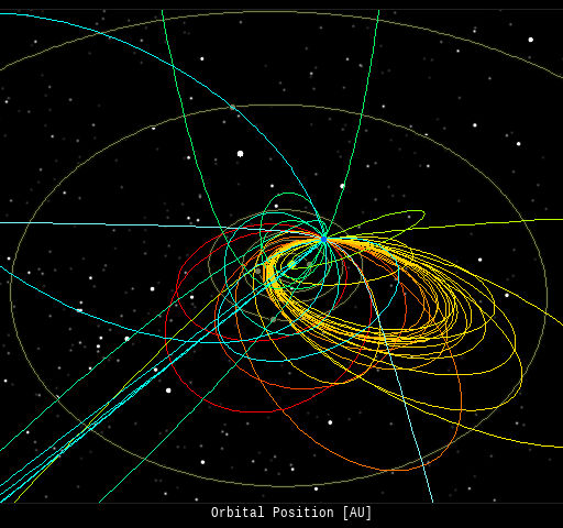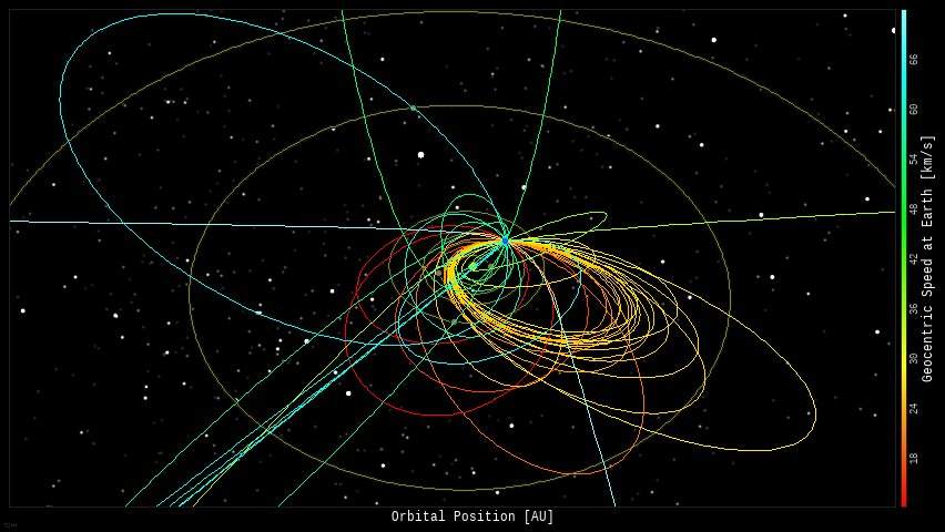 In this diagram of the inner solar system, all of the fireball orbits intersect at a single point--Earth. The orbits are color-coded by velocity, from slow (red) to fast (blue).