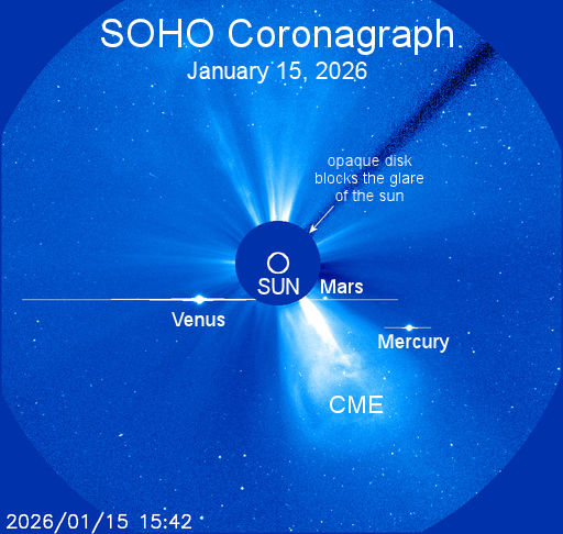 Two dates of special significance are coming up: Jan. 18th when Mars is less than 1 degree from Mercury, and Jan. 29th when Venus and Mercury are only 2/3rd of a degree apart. Join SOHO for a ringside seat.