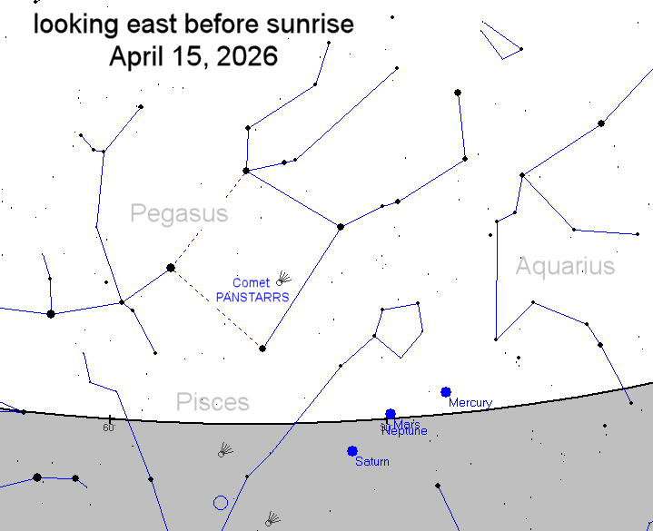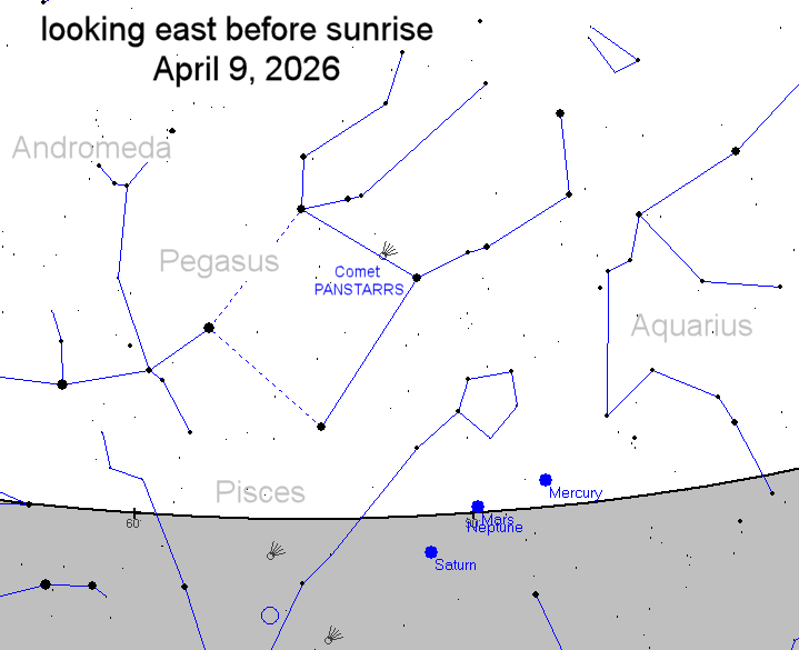 Between now and then, the comet may be found in the early morning sky shining through pre-dawn twilight. It is about as bright as a 5th magnitude star (data). Wide-field cameras with nighttime exposure settings will have no problem detectng the comet's long tail bisecting the constellation Pegasus. And the view through backyard telescopes is terrific.Set your alarm and take a look! Sky maps: April 9, 10, 11, 12, 13, 14, 15.
