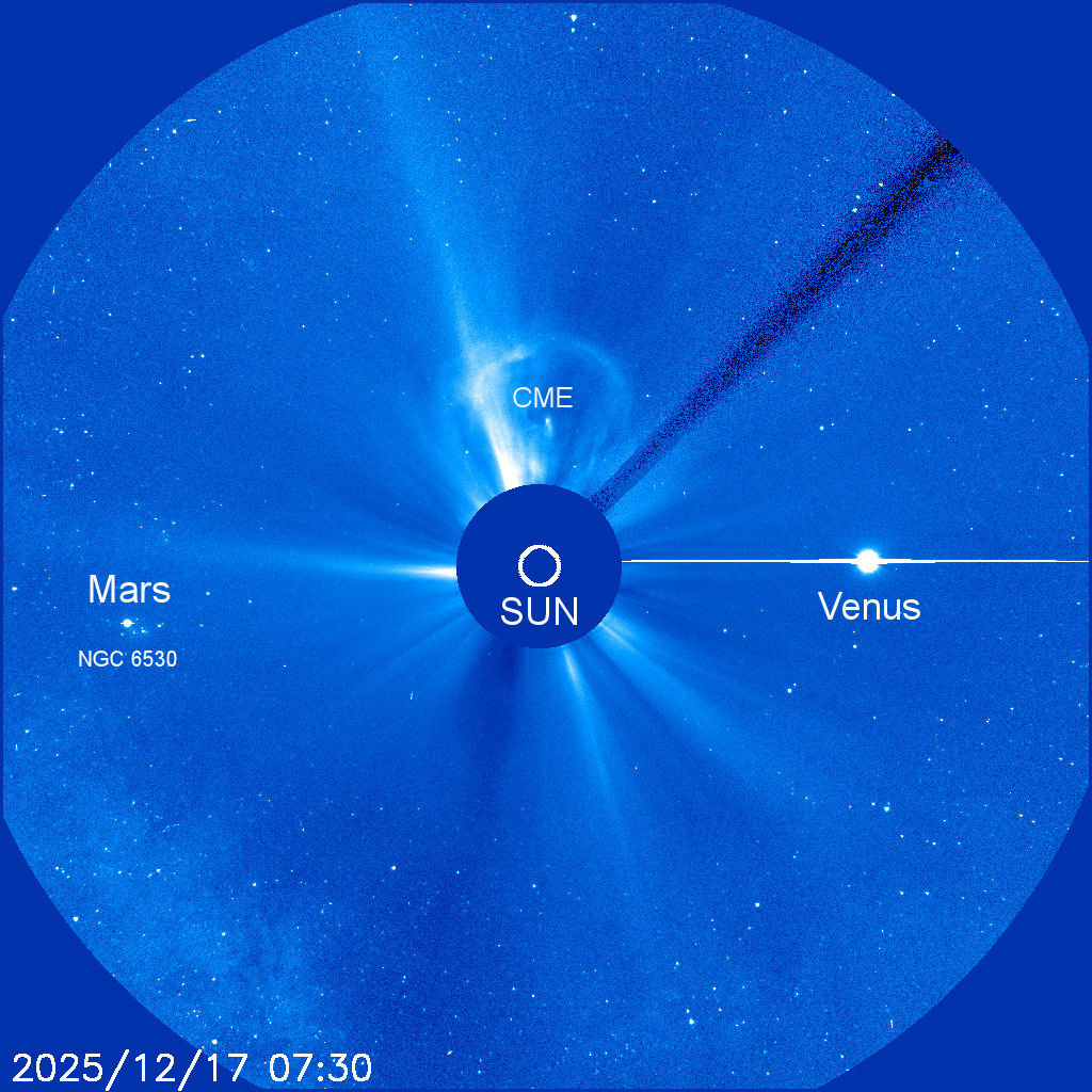 MARS AND VENUS ARE CONVERGING NEAR THE SUN: Are you looking for Mars or Venus? Don't! You will hurt your eyes. The two planets are very close to the sun, converging for a rare double solar conjunction. This coronagraph image from SOHO shows the two worlds on Dec. 17th with Mars in front of star cluster NGC 6530 at the same time.