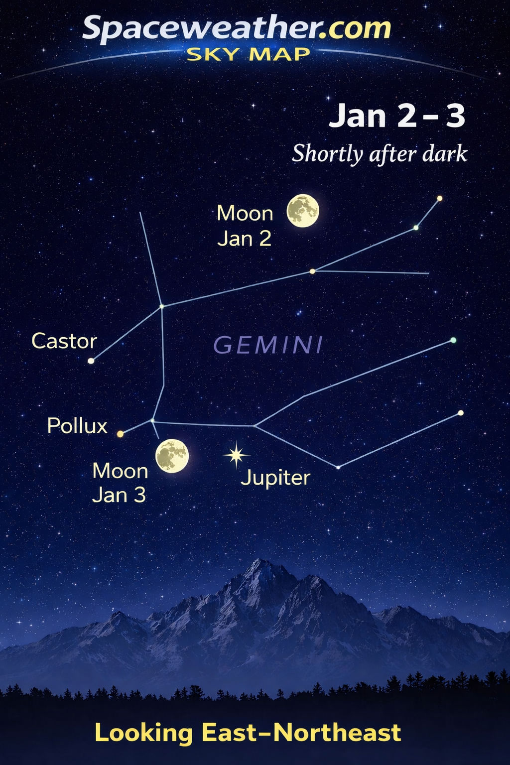 "We're going out again on Jan. 3rd," says Phillips. Why? "Because the Moon and Jupiter will be in conjunction," he explains. "We saw them converging on Jan. 2nd, and the view tonight will be even better." [sky map]