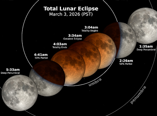 WHEN TO SEE THE LUNAR ECLIPSE: Wide awake at 3:00 a.m.? Studies show that sleep deprivation is a widespread problem. On the bright side, it's the perfect time to see tonight's total eclipse of the Moon. In the USA, totality is underway before sunrise on Tuesday, March 3rd, around 3 o'clock Pacific Time: