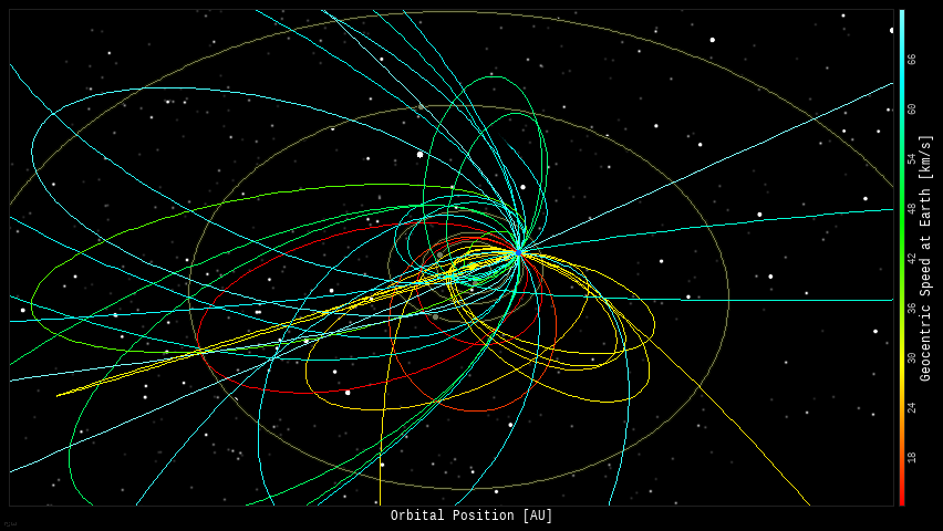 In this diagram of the inner solar system, all of the fireball orbits intersect at a single point--Earth. The orbits are color-coded by velocity, from slow (red) to fast (blue).