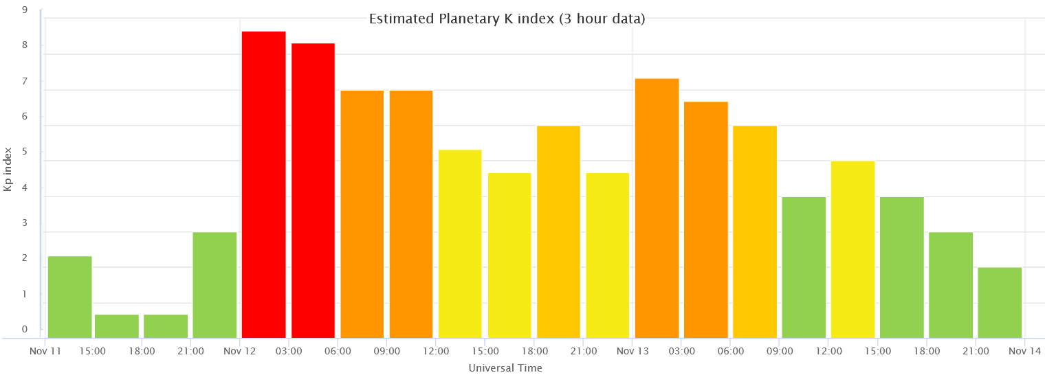Above: Planetary K-indices show the progress of the storm, ranging from severe (red) on Nov. 11th to minor (yellow) on Nov. 13th.