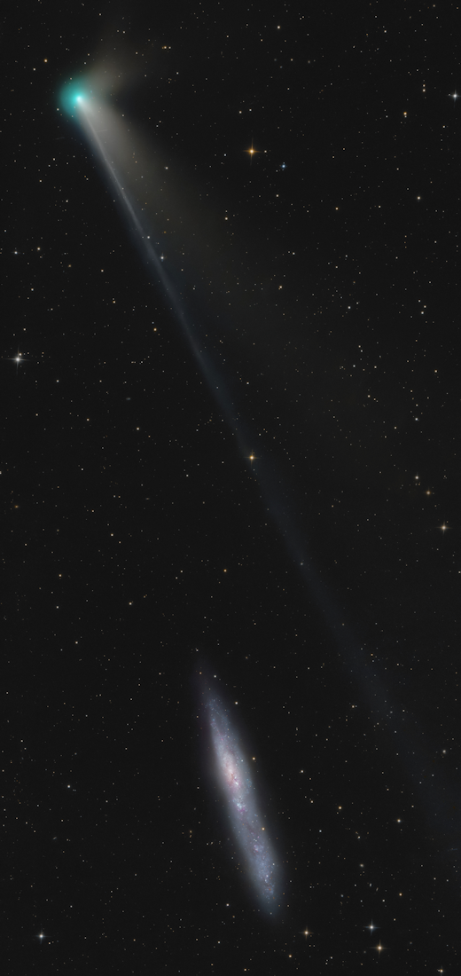 A HYPERBOLIC OORT CLOUD COMET: This conjunction was a million years in the making. On Feb. 9th, Daniele Gasparri of Atacama, Chile, photographed Comet Wierzchoś (C/2024 E1) gliding past the "string of pearls galaxy" NGC 55: