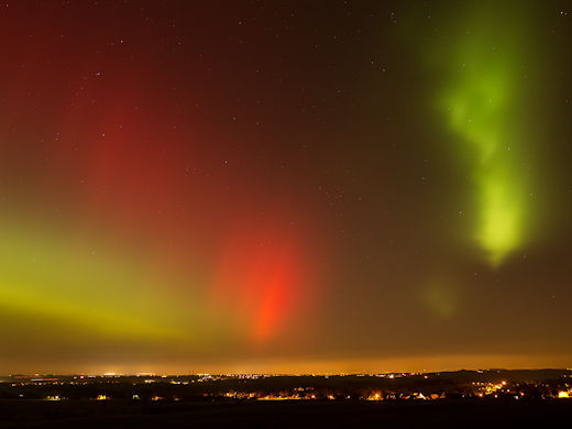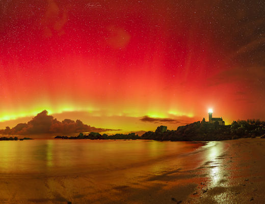"A fantastic show--unbelievable in France!" says photographer Alexandre Croisier, who positioned his camera on the beach near the Lighthouse of Pontusval. "The auroras were visible to the naked eye with nice green and red colors."