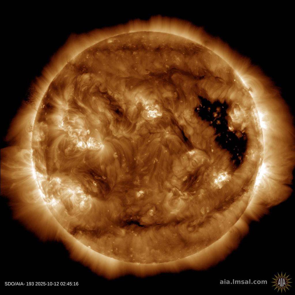 Solar wind flowing from this equatorial coronal hole should reach Earth on Oct. 12-13. Credit: NASA/SDO | more data