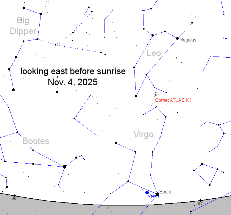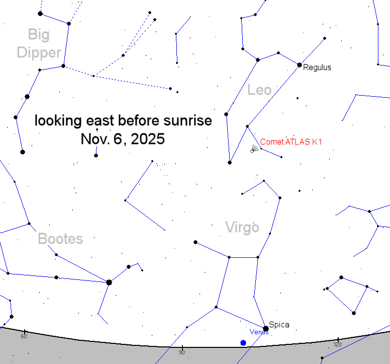 | | | SPACE WEATHER NOAA Forecasts | | Updated at: 2025 Nov 01 2200 UTC FLARE | 0-24 hr | 24-48 hr | CLASS M | 25 % | 35 % | CLASS X | 05 % | 10 % | Geomagnetic Storms: Probabilities for significant disturbances in Earth's magnetic field are given for three activity levels: active, minor storm, severe storm Updated at: 2025 Nov 01 2200 UTC Mid-latitudes | 0-24 hr | 24-48 hr | ACTIVE | 35 % | 25 % | MINOR | 20 % | 10 % | SEVERE | 05 % | 01 % | High latitudes | 0-24 hr | 24-48 hr | ACTIVE | 10 % | 15 % | MINOR | 30 % | 30 % | SEVERE | 50 % | 40 % | | | |  | | | | | | | | | | | This is an AI Free Zone: Text created by Large Language Models is spreading across the Internet. It's well-written, but frequently inaccurate. If you find a mistake on Spaceweather.com, rest assured it was made by a real human being. | | | FARSIDE SUNSPOTS ARE COMING: Helioseismic maps of the sun's farside reveal three sunspots only days away from turning toward Earth. One of them has been busy hurling CMEs into space ( #1, #2, #3). If this activity continues apace, Earth could soon be in the line of fire. CME impact alerts: SMS Text. A RARE GOLDEN COMET: Most comets are green, and sometimes blue. In June Lake, California, amateur astronomer Dan Bartlett is tracking a rare golden comet. Introducing, Comet ATLAS (C/2025 K1):  "This comet was not supposed to survive its Oct 8th perihelion (0.33 AU)," says Bartlett. "But it did survive, and now it is displaying a red/brown/golden color rarely seen in comets." What's going on? The chemistry of this Oort Cloud comet is strange. It lacks the carbon compounds normally found in comets, according to spectroscopy by David Schleicher of the Lowell Observatory. "All of the carbon-bearing species, including CN, are unusually low," he wrote in Astronomer's Telegram #17362. In sunlight, cometary gases turn green because of diatomic carbon (C2), and blue because of ionized carbon monoxide (CO+). Subtracting these colors apparently leaves gold. We don't know exactly why--or if it may have something to do with its recent close encounter with the sun. "The comet is fairly impressive at 9th magnitude," says Bartlett. That makes it a relatively easy target for backyard telescopes. Point your optics to the boundary between Virgo and Leo in the eastern sky shortly before sunrise. Sky maps: Nov. 2, 3, 4, 5, 6, 7. more images: from Chris Schur of Payson, Arizona; from Richard Sears of Ballico, California Realtime Space Weather Photo Gallery Free: Spaceweather.com Newsletter DODGERS SPACE BASEBALL: Move over, Shohei Ohtani. The students of Earth to Sky Calculus have just set a new home run record. This Dodger ball launched by the students sailed 123 kilometers, and touched the edge of space:  You can have it for $99.95. (The price might increase if the Dodgers win the World Series tonight :) The baseball traveled to the stratosphere onboard a cosmic ray balloon, alongside X-ray and gamma-ray sensors that the students use to study atmospheric radiation. After the data were collected, the payload parachuted back to Earth, landing in the desert near Gemfield, Nevada, more than 123 km from the California launch site. At the apex of the flight, the baseball was 35.4 km above the ground, experiencing temperatures as low as -62 C and air pressures only 0.2% of sea level. Now that's a homer. Far Out Gifts: Earth to Sky Store All sales support hands-on STEM education Realtime Aurora Photo Gallery Free: Spaceweather.com Newsletter Every night, a network of NASA all-sky cameras scans the skies above the United States for meteoritic fireballs. Automated software maintained by NASA's Meteoroid Environment Office calculates their orbits, velocity, penetration depth in Earth's atmosphere and many other characteristics. Daily results are presented here on Spaceweather.com. On Oct 31, 2025, the network reported 18 fireballs. (13 sporadics, 3 Northern Taurids, 1 Orionid, 1 omicron Eridanid) In this diagram of the inner solar system, all of the fireball orbits intersect at a single point--Earth. The orbits are color-coded by velocity, from slow (red) to fast (blue). [Larger image] [movies] Potentially Hazardous Asteroids ( PHAs) are space rocks larger than approximately 100m that can come closer to Earth than 0.05 AU. None of the known PHAs is on a collision course with our planet, although astronomers are finding new ones all the time. On November 1, 2025 there were 2349 potentially hazardous asteroids.  | Recent & Upcoming Earth-asteroid encounters: | Asteroid | Date(UT) | Miss Distance | Velocity (km/s) | Diameter (m) | | 2025 UZ7 | 2025-Oct-27 | 0.3 LD | 8.7 | 4 | | 2025 UF3 | 2025-Oct-27 | 6.2 LD | 3.2 | 13 | | 2025 UH6 | 2025-Oct-27 | 2.4 LD | 8.5 | 12 | | 2025 UK7 | 2025-Oct-27 | 18.2 LD | 12.5 | 17 | | 2025 UO9 | 2025-Oct-27 | 8.5 LD | 7.2 | 15 | | 434196 | 2025-Oct-27 | 17.4 LD | 10.9 | 171 | | 2025 UM8 | 2025-Oct-28 | 7.3 LD | 14.8 | 36 | | 2025 UH11 | 2025-Oct-28 | 3.3 LD | 14 | 13 | | 2025 UD9 | 2025-Oct-28 | 0.6 LD | 10.4 | 13 | | 2025 UC8 | 2025-Oct-28 | 1.3 LD | 8.1 | 10 | | 2025 UD7 | 2025-Oct-28 | 5.8 LD | 8.6 | 12 | | 2025 UQ11 | 2025-Oct-28 | 2 LD | 10.4 | 14 | | 2025 UQ1 | 2025-Oct-28 | 10.4 LD | 5.8 | 10 | | 2025 UR11 | 2025-Oct-29 | 1.3 LD | 7 | 5 | | 2025 UV7 | 2025-Oct-29 | 0.3 LD | 9.6 | 4 | | 2025 UG11 | 2025-Oct-29 | 2.4 LD | 6 | 7 | | 2025 UD5 | 2025-Oct-29 | 2.5 LD | 3.2 | 20 | | 2025 UH2 | 2025-Oct-29 | 19.3 LD | 8.9 | 29 | | 2025 UV5 | 2025-Oct-29 | 4.3 LD | 5.6 | 18 | | 2025 UF9 | 2025-Oct-29 | 0.8 LD | 19.7 | 37 | | 2025 UB12 | 2025-Oct-29 | 0.6 LD | 17.7 | 4 | | 2025 UF5 | 2025-Oct-29 | 2 LD | 3 | 10 | | 2025 UX7 | 2025-Oct-29 | 0.9 LD | 20 | 7 | | 2025 UG12 | 2025-Oct-29 | 2.7 LD | 6.8 | 10 | | 2025 UP7 | 2025-Oct-29 | 4 LD | 13.8 | 13 | | 2025 UL2 | 2025-Oct-29 | 3.9 LD | 12.4 | 22 | | 2025 UF12 | 2025-Oct-30 | 2.4 LD | 8.9 | 14 | | 2025 UC11 | 2025-Oct-30 | 0 LD | 11.4 | 1 | | 2025 UF4 | 2025-Oct-30 | 15.3 LD | 10.2 | 78 | | 2025 UE9 | 2025-Oct-30 | 3.4 LD | 24.5 | 18 | | 20