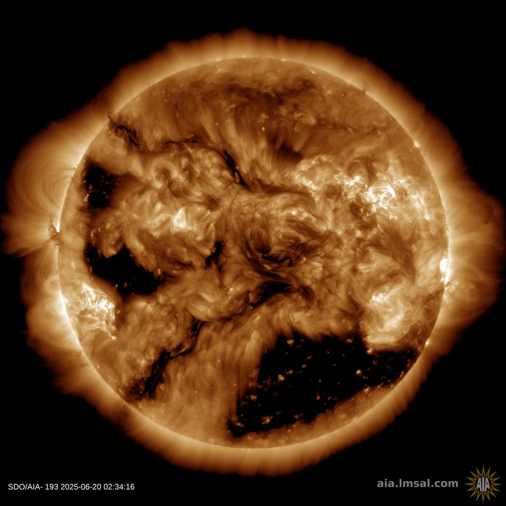 | | | Switch to: Europe, USA, New Zealand, Antarctica Credit: NOAA/Ovation Planetary K-index Now: Kp= 2.33 quiet 24-hr max: Kp= 3.00 quiet explanation | more data Interplanetary Mag. Field Btotal: 8.12 nT Bz: 3.95 nT north more data: ACE, DSCOVR Updated: Today at 1147 UT Coronal Holes: 20 Jun 25  Earth is inside a stream of solar wind flowing from this large southern coronal hole. Credit: NASA/SDO | more data Polar Stratospheric Clouds Colorful Type II polar stratospheric clouds (PSC) form when the temperature in the stratosphere drops to a staggeringly low -85C. NASA's MERRA-2 climate model predicts when the air up there is cold enough:  On Jun 20, 2025, the Arctic stratosphere is much too hot for polar stratospheric clouds. | more data. Noctilucent Clouds The northern season for noctilucent clouds has begin. First reports of the electric-blue clouds came from Russia on May 28, 2025. Since then, the clouds have spread to lower latitudes with one possible sighting in southern Italy on June 3, 2025.
