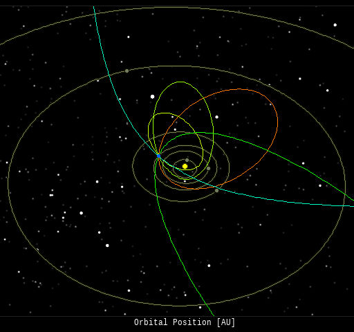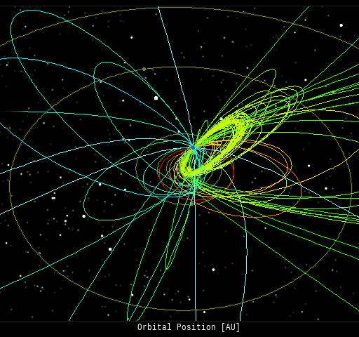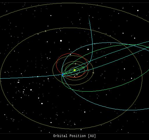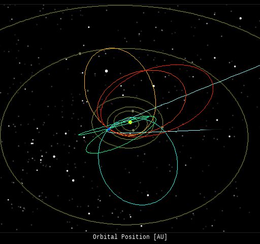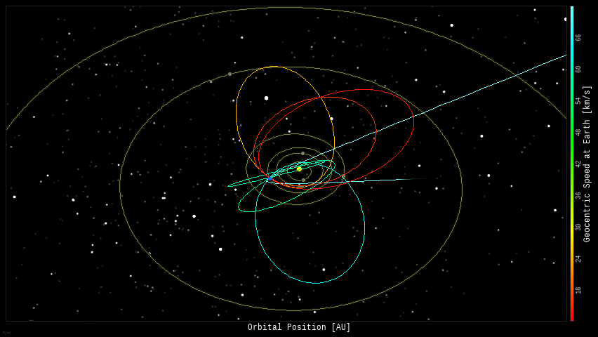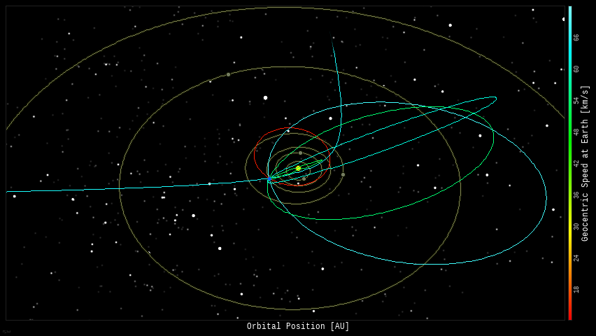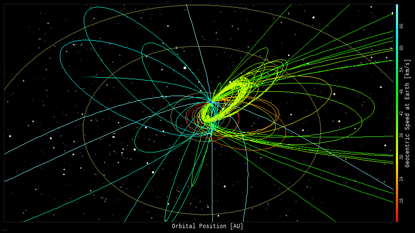 In this diagram of the inner solar system, all of the fireball orbits intersect at a single point--Earth. The orbits are color-coded by velocity, from slow (red) to fast (blue).