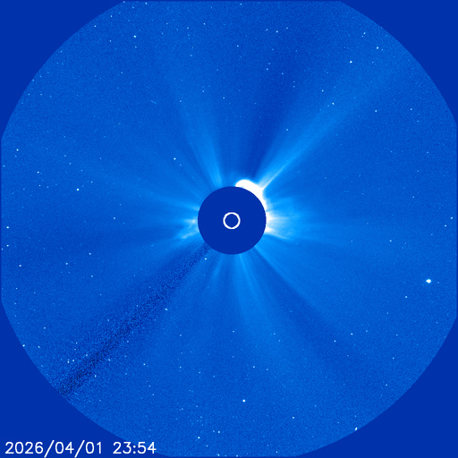 SUNDIVING COMET ALERT: Comet MAPS (C/2026 A1) is falling toward the sun for a *very* close encounter. On April 4th, it will swoop through the sun's atmosphere only 160,000 km from the sun's surface. Will it survive? The odds favor "no." The comet's core is only 400 meters wide, which is probably too small to handle the heat. We'll soon find out. The comet's death dive is visible in SOHO coronagraphs; it's the tadpole in the lower left of this image. Stay tuned for updates.