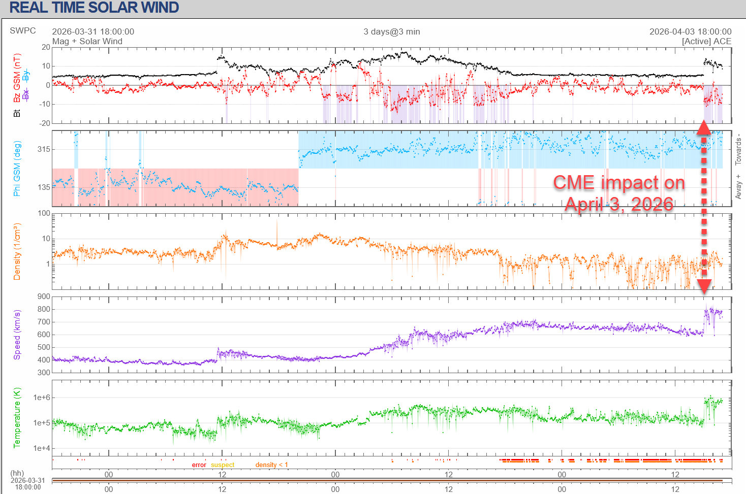 CME IMPACT SPARKS STRONG GEOMAGNETIC STORM: A strong G3-class geomagnetic storm is underway on April 3rd following the impact of a CME at 1529 UTC. Mid-latitude auroras may be visible from dark-sky sites after local night fall. This storm is happening as the crew of Artemis II move through Earth's magnetotail, an unusual space weather environment that human explorers have rarely experienced. Aurora alerts: SMS Text
