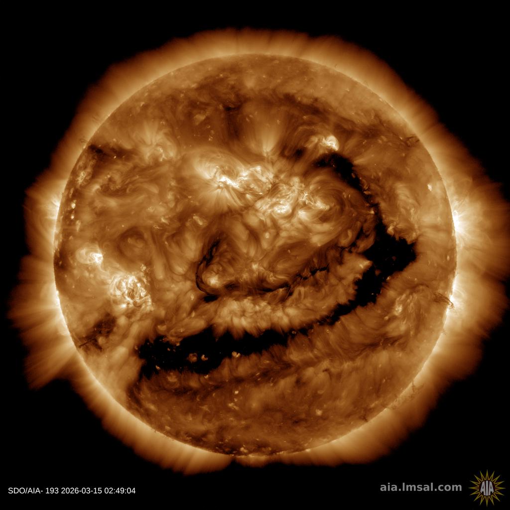 Flowing from a narrow hole in the sun's atmosphere, the solar wind is blowing almost 700 km/s (1.6 millon mph). High-latitude auroras should persist as long as Earth remains inside the stream--perhaps another 12 to 24 hours. Aurora alerts: SMS Text