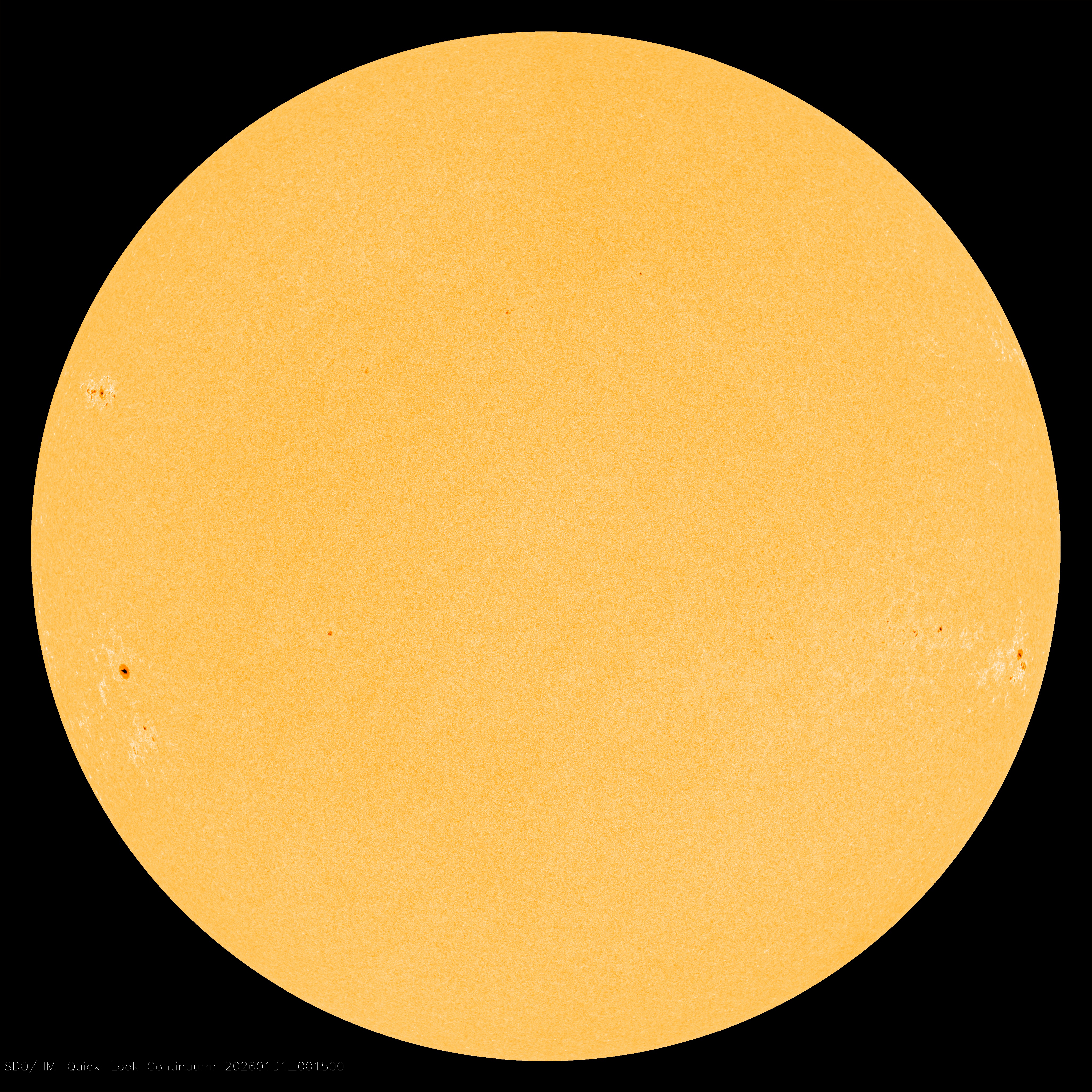 Solar activity should remain low this weekend. None of these sunspots has an unstable magnetic field that pose a threat for explosive solar flares. Credit: NASA/SDO