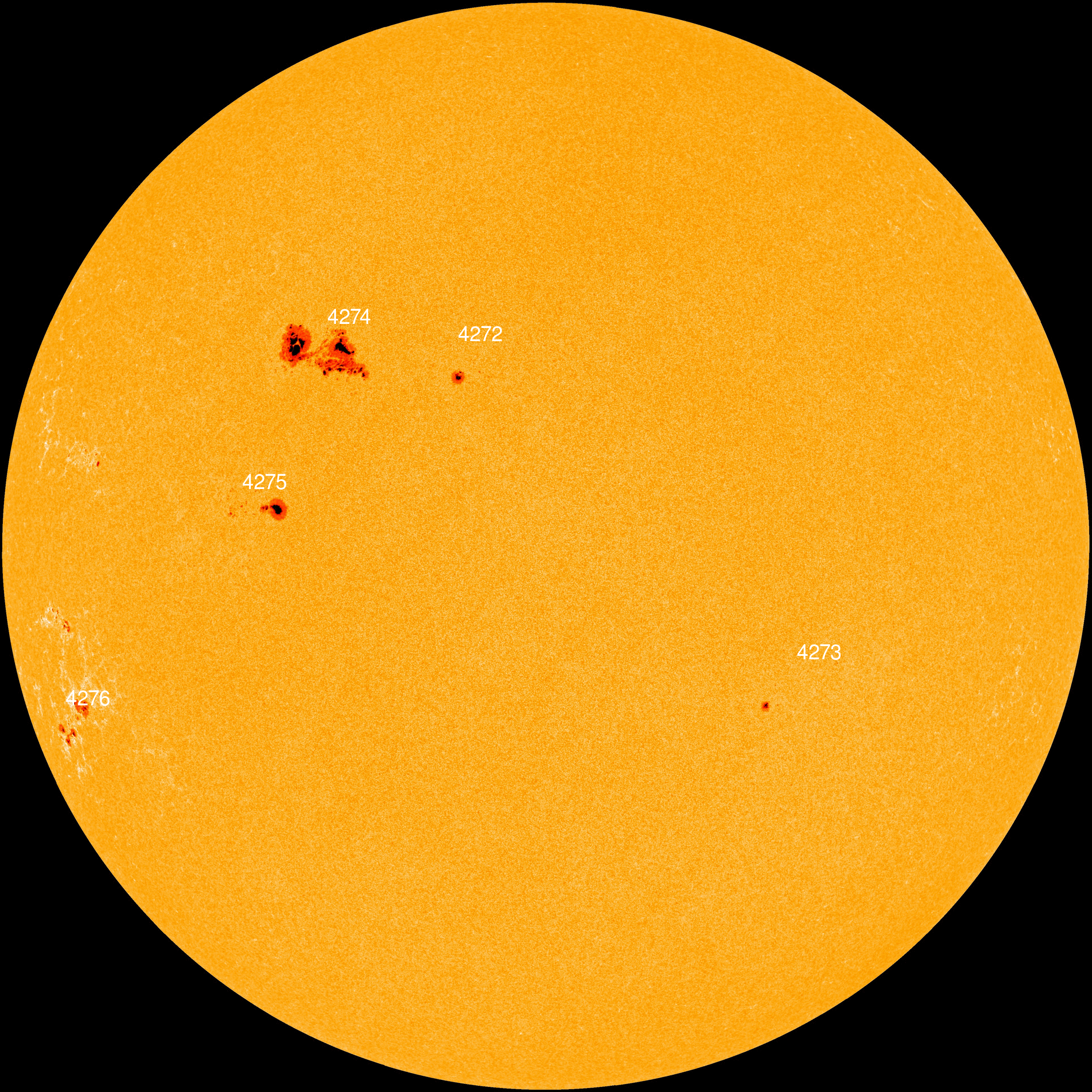According to Hale's Law, the sunspot's magnetic poles should be oriented -/+, that is, negative (-) on the left and positive (+) on the right. Instead, they are twisted 90 degrees; positive (+) is on top and negative (-) is on the bottom. Sunspot 4274 is breaking the law.