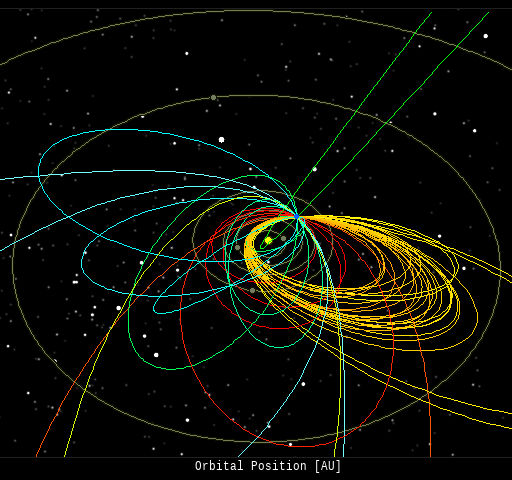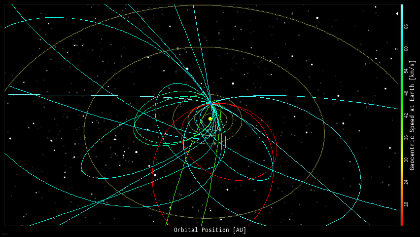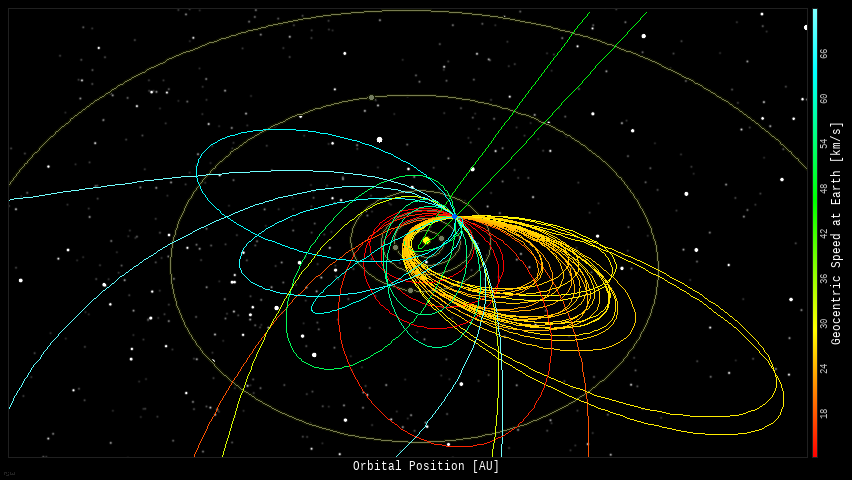 In this diagram of the inner solar system, all of the fireball orbits intersect at a single point--Earth. The orbits are color-coded by velocity, from slow (red) to fast (blue).