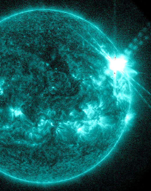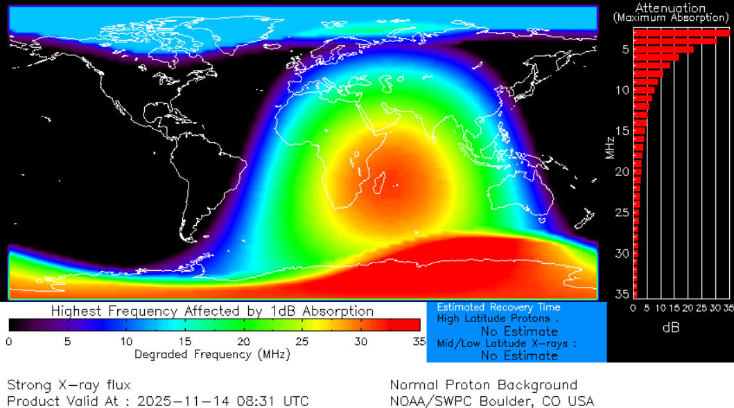ANOTHER MAJOR SOLAR FLARE: Sunspot 4274 erupted again today (Nov. 14 @ 0830 UTC), producing an X4-class solar flare. Extreme ultraviolet radiation from the flare caused a shortwave radio blackout over the Indian Ocean. More importantly, the explosion hurled a CME into space: