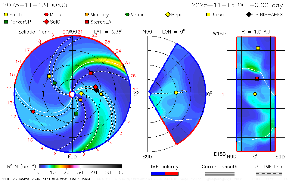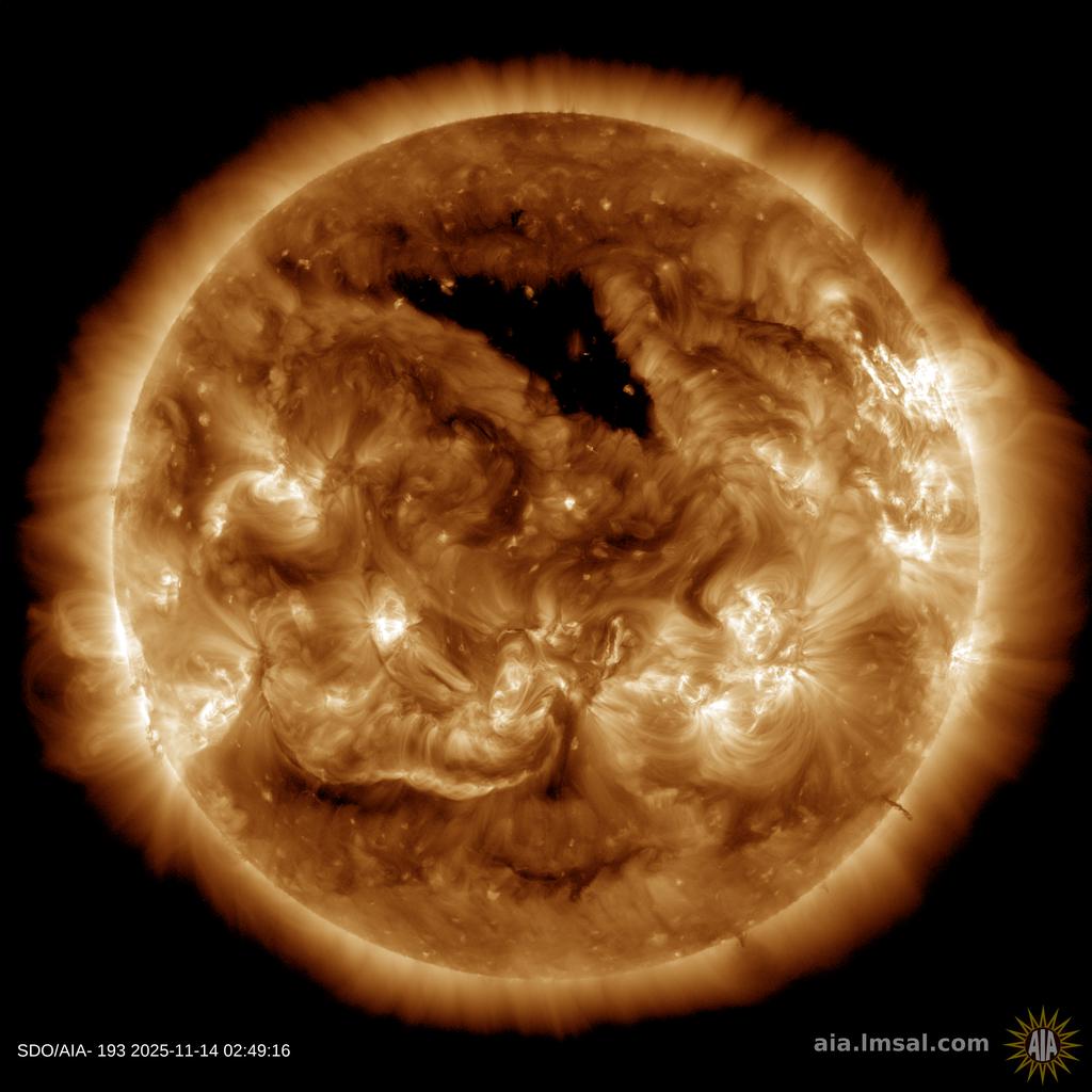 Most of this fast-moving CME will miss Earth. However, a NASA model suggests that it could deliver a glancing blow to our planet's magnetic field late on Nov. 16th. If so, the impact could spark minor to moderate (G1/G2) geomagnetic storms. That would be nothing like the severe storms of Nov. 11/12, but still a potentially nice display of auroras for high-latitude sky watchers. Aurora alerts: SMS Text.