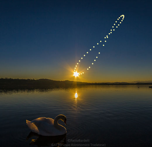 Italian photographer Paolo Bardelli stitched together 48 pictures spanning 12 months to reveal the analemma over Lake Varese. The low-hanging solstice sun is highlighted: