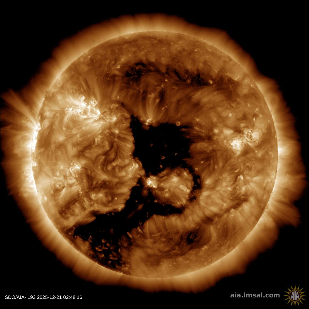 THE FORECAST CALLS FOR CHRISTMAS LIGHTS: A hole in the sun's atmosphere is directly facing Earth, and it is spewing a stream of high-speed solar wind in our direction. G1-class geomagnetic storms are possible on Dec. 23-24 when the gaseous material arrives. Aurora alerts: SMS Text.