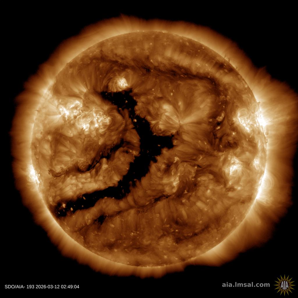 PI DAY GEOMAGNETIC STORM WATCH: Minor G1-class geomagnetic storms are possiblecon March 14th (Pi Day) when a stream of solar wind is expected to hit Earth's magnetic field. The gaseous material is flowing from a long narrow hole in the sun's atmosphere. Aurora alerts: SMS Text