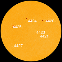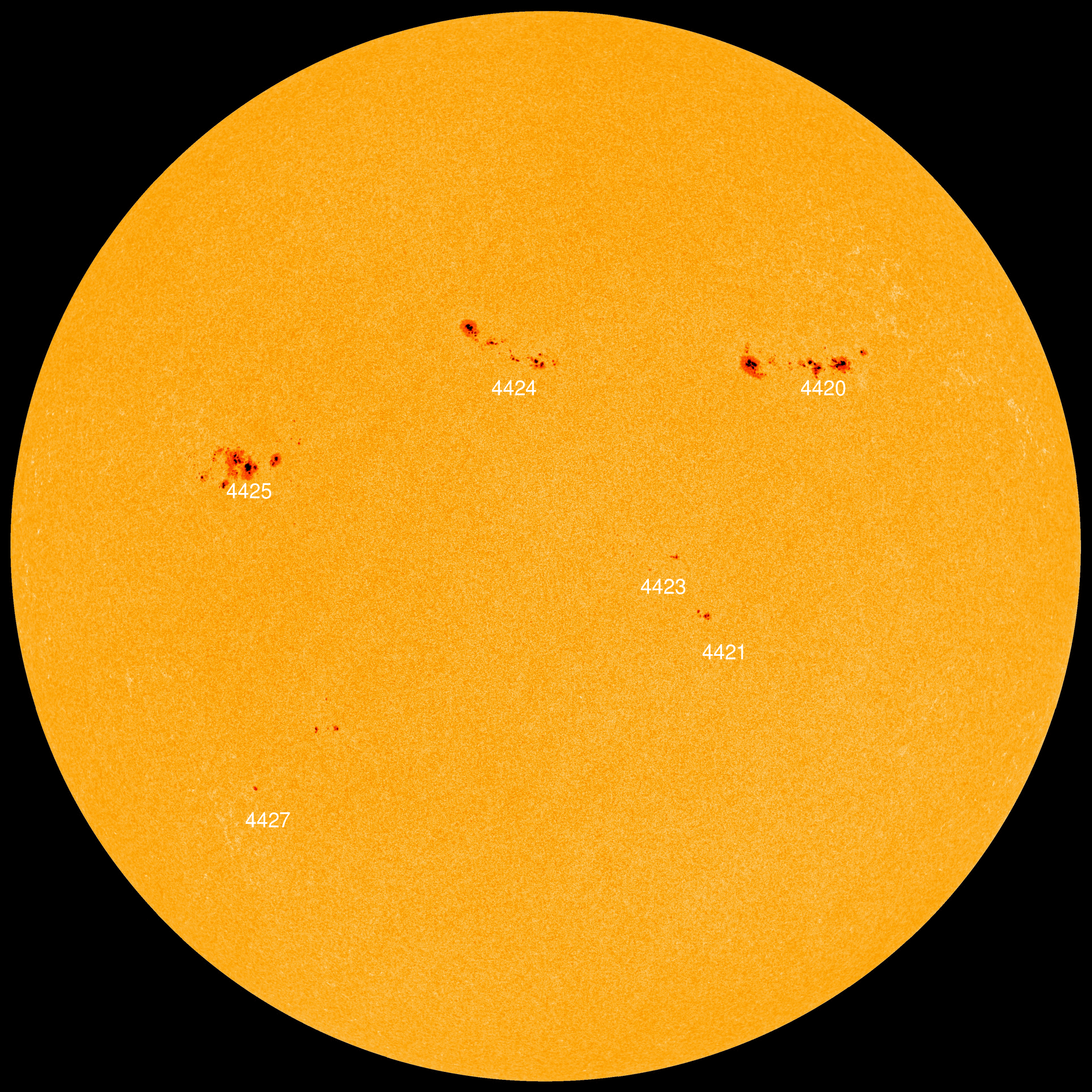 Sunspots 4420 and 4425 have unstable 'beta-gamma-delta' magnetic fields that harbor energy for X-class solar flares. Credit: NASA/SDO