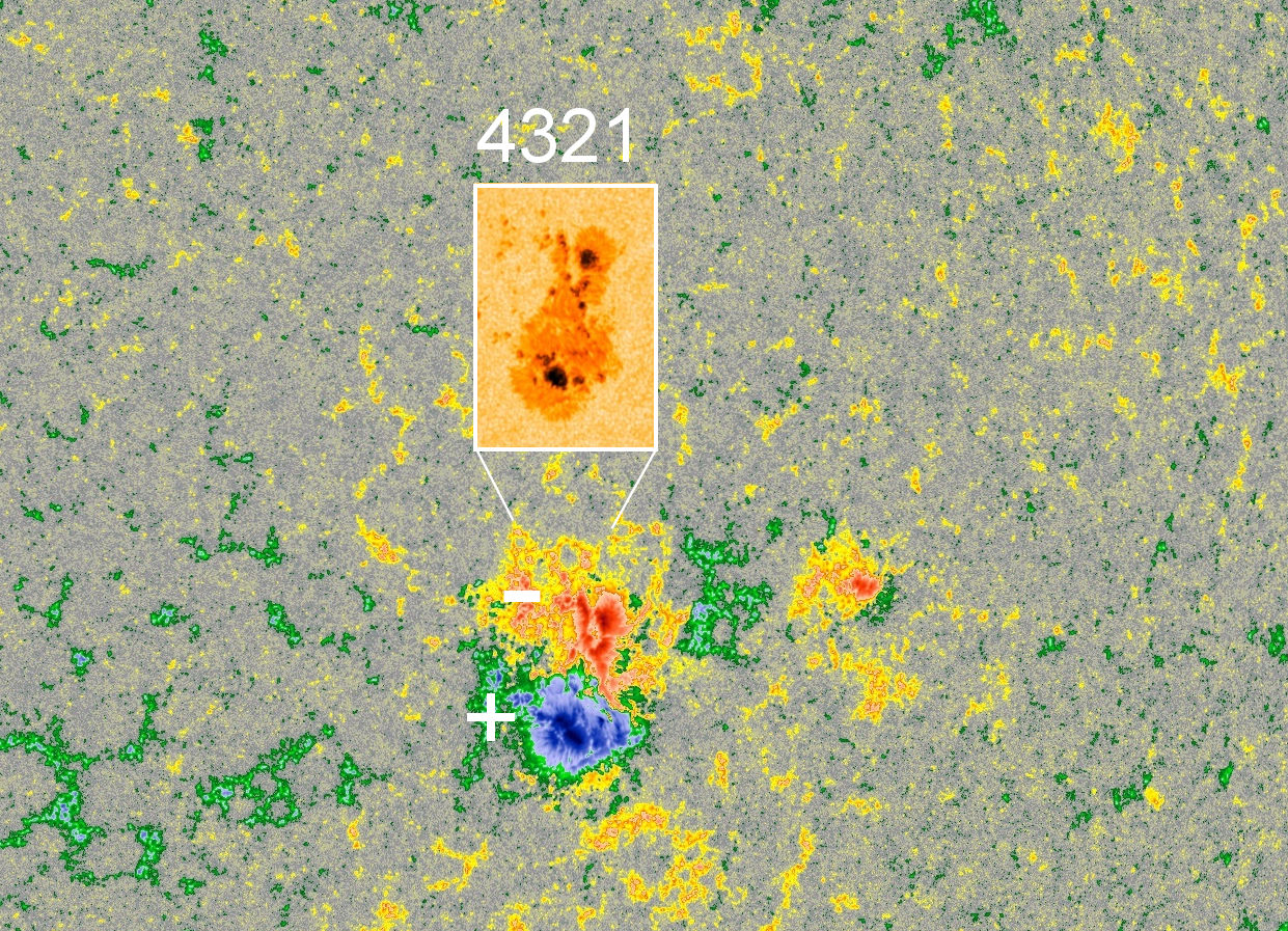 A TWISTED SUNSPOT: The magnetic field of sunspot 4321 is unusual. According to Hale's Law, the sunspot's magnetic polarity is supposed to look like this: . Instead, it's like this: . The 90-degree twist is a sign of magnetic tension that could produce a strong M or X-class solar flare. Solar flare alerts: SMS Text.