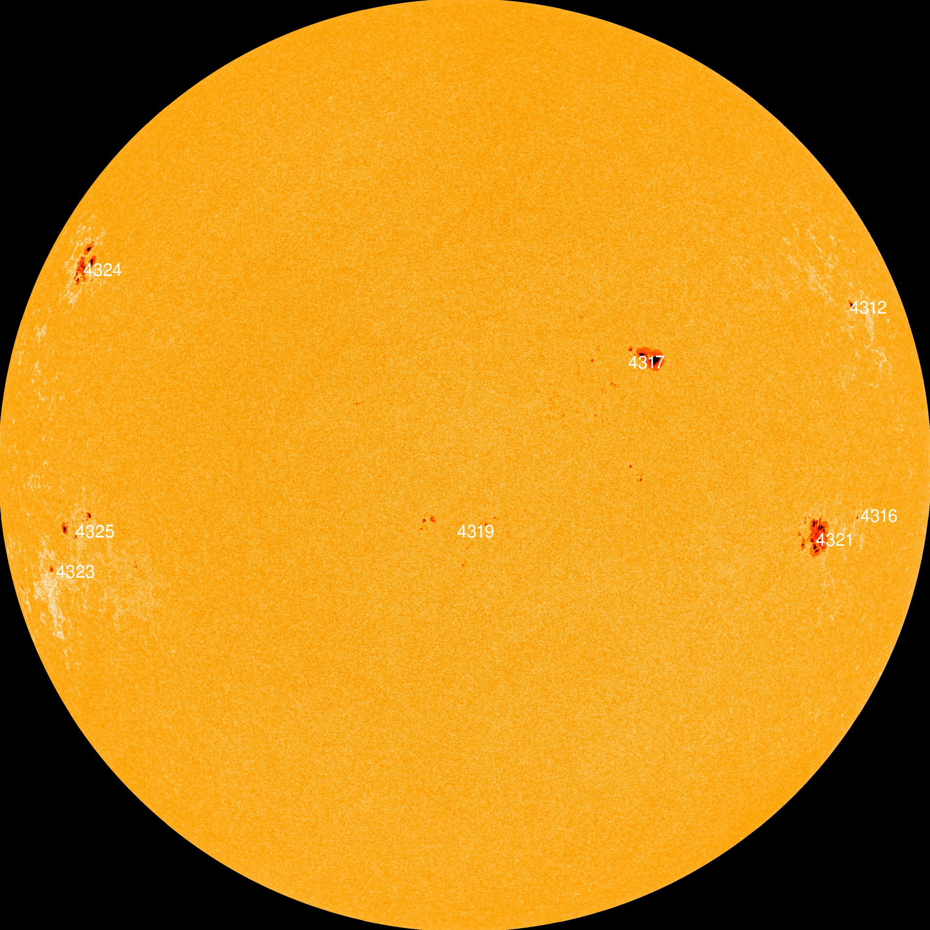 A spectroheliograph is a special telescope which can photograph the sun at a single narrow wavelength of light--in this case, the "H-alpha" wavelength emitted by solar hydrogen. Rouviere's spectroheliograph image reveals a large number of sunspots. They don't look black, however. Most of the sunspots are located beneath bright white clouds of hydrogen. These clouds are trapped by the sunspot magnetic fields and energized by the underlying dark cores.