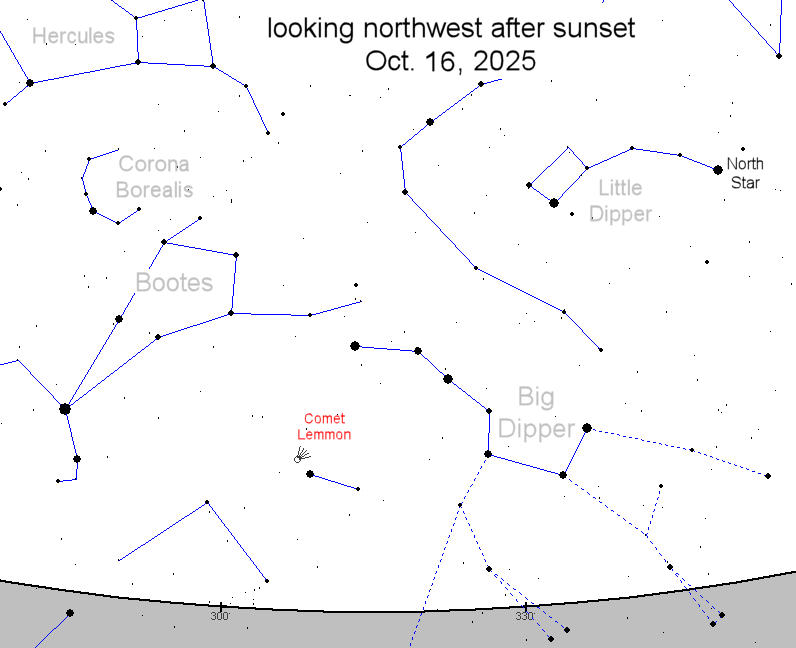 Look for Comet Lemmon low in the northeastern sky after sunset, and let the Dipper be your guide. Sky maps: Oct. 13, 14, 15, 16, 17, 18, 19, 20, 21.